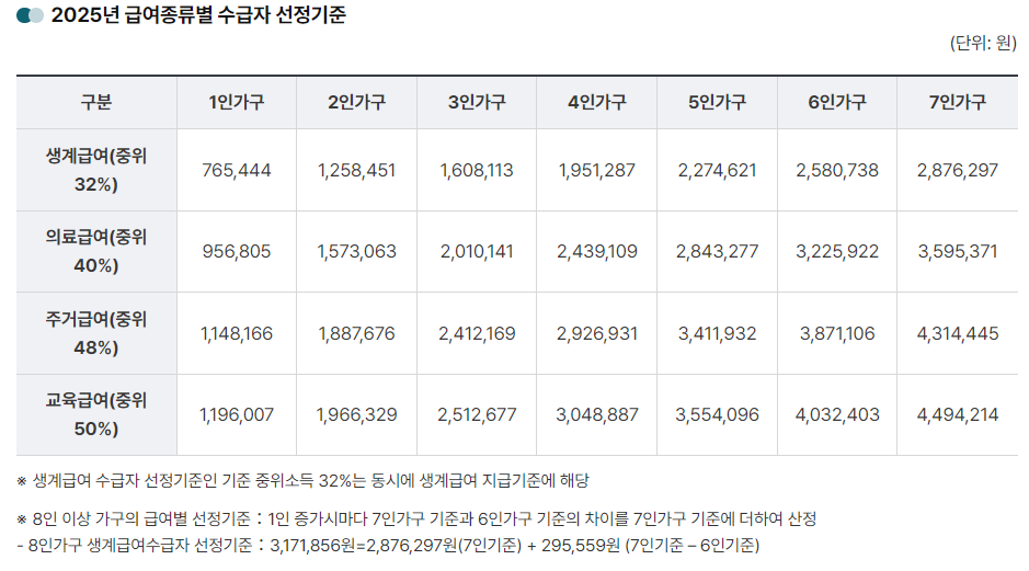 생계급여: 기준 중위소득의 32% 이하 – 최저 생계유지를 위한 현금 지원